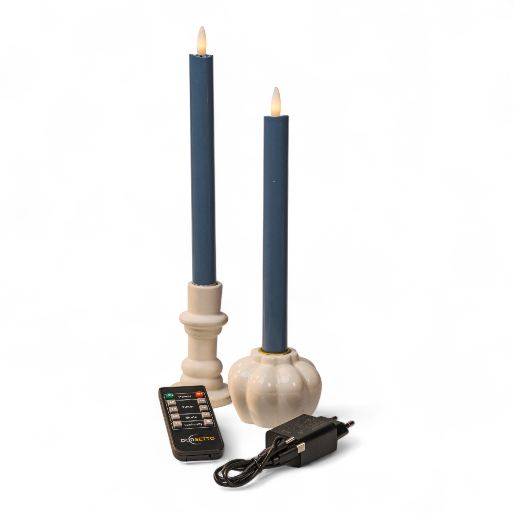 Setet består av två dinerljus med en höjd på 250 mm, en fjärrkontroll, en laddkabel som gör det möjligt att ladda båda ljusen samtidigt samt en adapter.